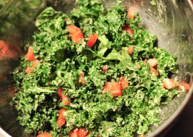 Pica y corta la col rizada en trozos pequeños, agrega aceite de oliva virgen, aguacate y sal – Revolver muy bien con las manos.