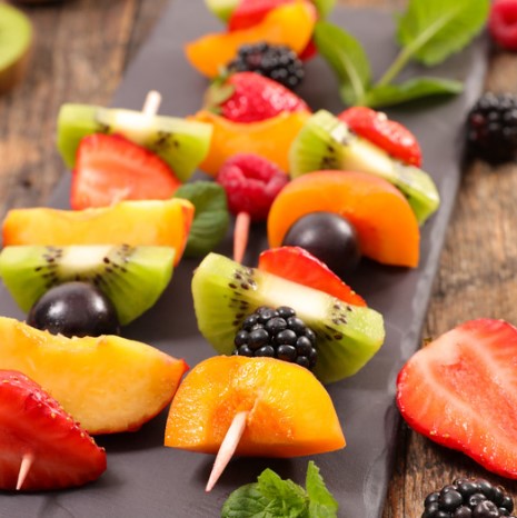 Desliza las piezas de fruta en un pincho de madera y diseña tu propia brocheta poniendo tanta fruta como quieras, hasta que el palo está casi cubierto de extremo a extremo.