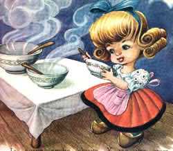 Contemplando los humeantes cuencos de avena, Ricitos de Oro pensó: "Seguro que a quien vive aquí no le importará que tome sólo un sorbo". Se sentó en la primera silla y tomó un sorbo. "¡Ah!", dijo, "está demasiado caliente".